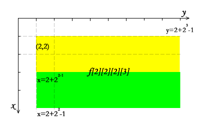 \(f[x][y][i][j] = \left\{ {\begin{array}{ll}{\max \left\{ {\begin{array}{ll}{f[x][y][i][j – 1]} \\{f[x][y + 2^{j – 1} ][i][j – 1]} \\\end{array}} \right.} & i=0\\{\max \left\{ \begin{array}{ll}f[x][y][i – 1][j] \\f[x + 2^{i – 1} ][y]i – 1][j] \\\end{array} \right.} & i\ne 0 \\\end{array}} \right.\)