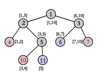这个问题的由来是这样的,架设有一段[1,10]的区间为红色,其子树为[1,5],[6,10]我么现在要对[5,7]染成蓝色,怎么做呢?