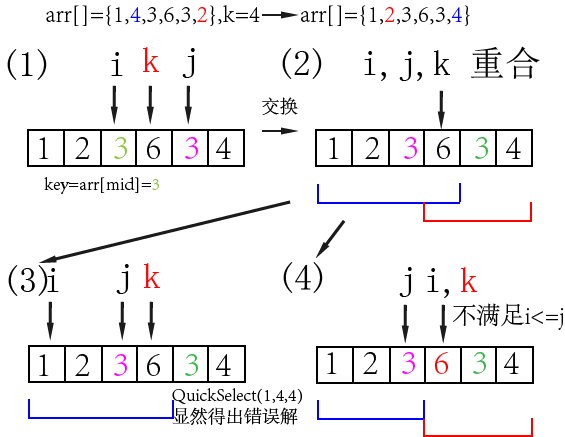 出错其实是一种极端情况,即向右扫描的指针i和向左扫描的指针j重合于k位置;.(这种巧合真的不大常见,但是还是让我给碰上了,如果没碰上,估计我的错误也不会被纠正.)